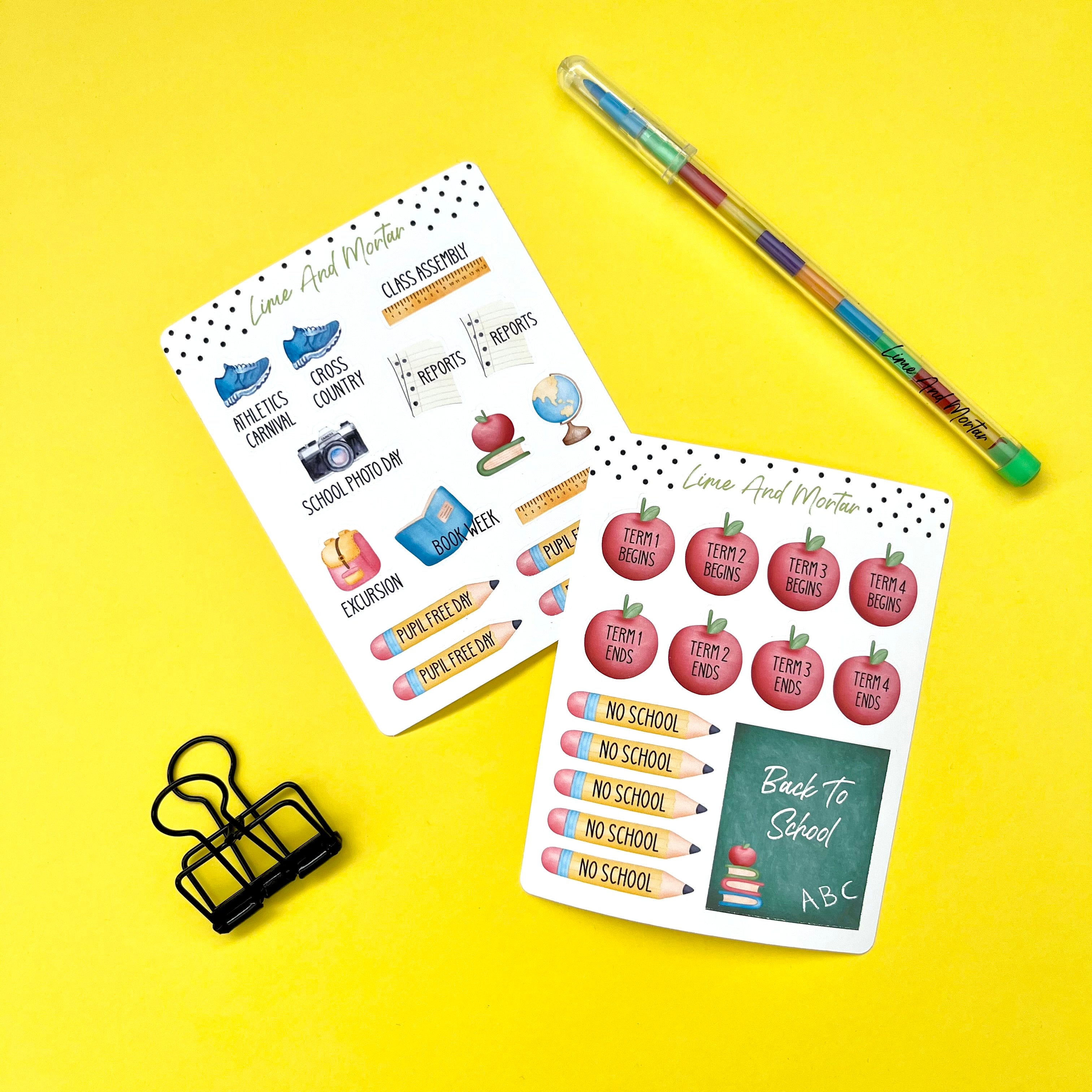 Use these stickers to remind yourself when the school term begins and ends and pupil free days. They are printed on premium matte sticker paper and come kiss cut on a sheet ready to stick into your planner.